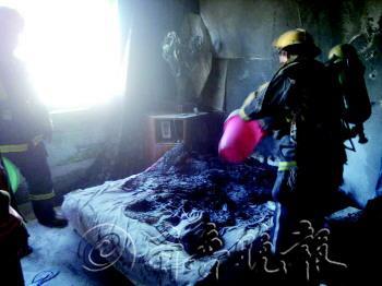 消防人员赶到后,踹开着火房间的门发现,这个20平方米左右的房间里,靠墙的单人床正在燃烧,床边就是笔记本电脑和电视。消防人员用楼道灭火器把明火扑灭,然后接了盆水浇在燃烧后的床上,防止复燃。
