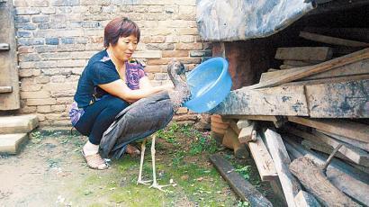 据田锁富的妻子田小东介绍,她家的鸡场在屋后的半山坡上,“大鸟”就是在自家的鸡场中被发现的。“它受伤了且不吃不喝,我们担心它的伤势,更怕它饿死。”田小东说。记者在田锁富家的院子里见到了这只“大鸟”,它身高80厘米左右,颈、腿都很长,通体呈黑色,头顶隐约呈现出红色,颈边呈灰色。
