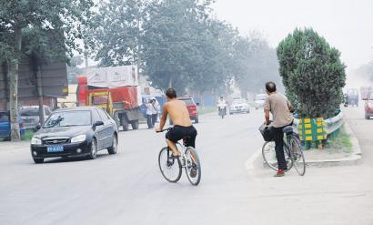 运城出入口行人随意骑自行车逆行。