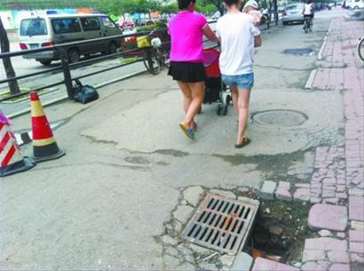 昨日下午,北国网、辽沈晚报记者来到联合路7号枫尚捷宾馆门前,发现下水井旁确实有一个深约半米的坑。里面还扔有垃圾。而在离塌陷3米的地方,放着两个隔离墩。