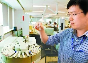 实验人员将样本放入检测仪器中