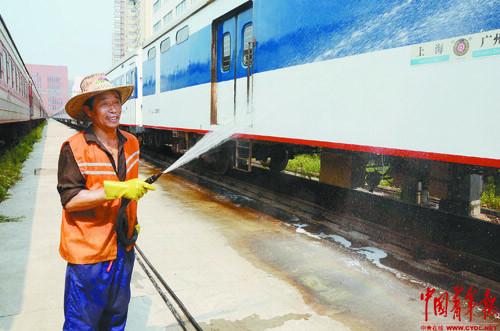 7月31日,上海客技站内,来自江苏连云港的清洁工人何守安正在清洗上海至广州的T99/100次列车。本报记者 周凯摄