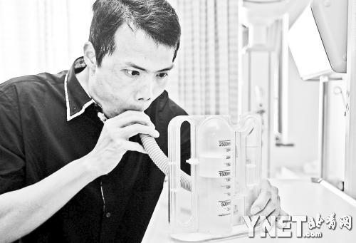 8月1日,江苏无锡,在历经近40天的开胸换肺手术治疗后,“开胸验肺”第一人张海超终于迈着健康的步伐走出了无锡市人民医院,开始新的生活。图为早晨,张海超再次测试了肺活量,已达到2000ml,接近正常人的水准。