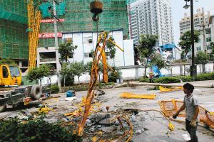 8月1日,工人在清理塔吊倒塌事故现场 记者 侯智 摄