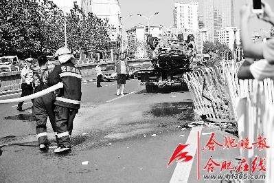 记者在现场看到,事发轿车四脚朝天翻在马路中,一段近20米长的护栏被压在车下,猛烈的撞击下,轿车车头完全变形,已看不出原貌。而油箱也在撞击中破损,汽油不断渗出,闻讯赶到的消防官兵手持水枪,在旁严阵以待。由于轿车与护栏搅在一起,极难分离,消防官兵不得不动用专门器械对轿车的部分位置进行切割。与此同时,交警部门在事发路段加派警力,指挥过往车辆有序通行。