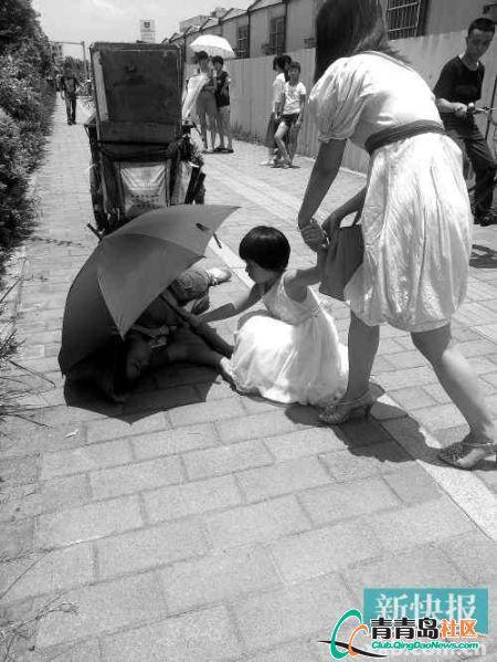 一名戴着草帽的女清洁工,捱不过烈日暴晒,一头栽倒在路边昏迷不醒。其他路人驻足观望,无人施援。这时,一名跟妈妈路过的小女孩停了下来,用自己的雨伞遮住了女清洁工,并对妈妈说:“妈妈,快救人!”