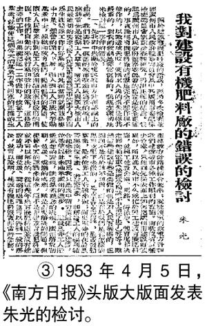 1953年4月5日,《南方日报》头版以整版篇幅报道此事,其中还包括了朱光发表的《我对建设有机肥料厂的错误的检讨》一文,对实践承担责任。报纸同时还配以社论,可见当时对待事件的严肃态度。