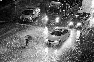 上图:经过了一天的高温灼烤,昨夜京城突降大雨。丰台区梅市口路,行人正在穿行路口,在车辆灯光映照下,密集的雨点倾泻在道路上。