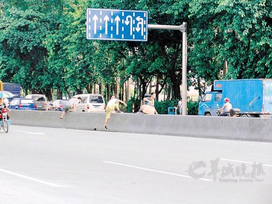 昨日下午,记者来到广花一路的夏茅客运站公交站一探究竟。广花一路中间的水泥栏杆分开南北双向的车道,在夏茅客运站公交车站牌所在的路段,行人下车后对高度超过一米的水泥栏杆“视而不见”,以各种姿势躲避来往的车辆,并翻越栏杆,险象环生。其中有“男女互助团”,男士矫健地翻越栏杆后,从旁协助女性朋友艰难翻过,再由男在外、女在内的阵容瞅准时机拦车过马路;有“列队齐步走”,互不相识的路人瞅着马路上车辆较少,排开一列横队同时过马路,队列整齐、步伐统一;有人采用“躲闪钻空术”,在车速较慢或停止的车辆前后钻着空隙而过,随时可能与车辆来个“零距离接触”;有的只身一人“闪电跨栏”;有的甚至拖儿带女、怀抱婴儿跨栏过马路,看得人心惊肉跳……记者观察发现,在10分钟内,跨栏过马路的市民已经达到近百人,严重影响了路面交通。