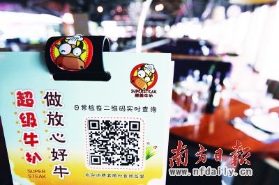 “超级牛扒”遭市食安局查处后全面整改,餐桌上放着二维码信息供消费者即时查询。徐文阁 摄