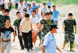 昨日中午,救援人员在水中找到一具遇难学生的遗体