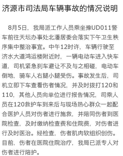 针对媒体报道昨日河南省济源市警车撞人后遭市民围堵事件,济源市司法局发布《济源市司法局车辆事故的情况说明》。回应称:5日12时许,济源市司法局警车豫UD011在济水大道鸿运楼附近与一辆电动车发生事故。得到司乘人员报告后,局领导高度重视,派人到医院配合救助伤者。经检查,伤者软组织创伤。目前,伤者已经得到及时救治,事故正由交警部门进行调查处理。对此前各界议论纷纷的事发车辆上俩“领导”怕热拒不下车救人一事,情况说明中则只字未提。
