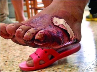 周女士告诉记者,她家的这个脸盆是2年前新房装修时在六合的宝润家居城买的,当时她看这个牌子还可以,而且与经销商郭某聊起送货地址时,无意间发现,郭某也住她家的小区,而且是隔壁楼栋的邻居,在郭某的游说下,周女士又多买了10多样卫浴物件,总价4000元左右。周女士说,其中的这个钢化玻璃面盆,价格是480元,大约1厘米厚,据称是耐高温防爆裂的,谁知才用了2年就出了问题。据周女士描述,事发的时候,周女士的老公大约在15分钟前洗了一把冷水脸,之后周女士刚准备刷牙时,玻璃台盆突然出现了爆裂,周女士左脚面被碎玻璃砸伤,当场鲜血直流。周女士当场打电话给经销商郭某,郭某一听说周女士在家用玻璃面盆时受了伤,不愿意出面,只答应愿意与厂家联系,赔一个新的面盆给周女士。周女士说,这个经销商售前售后态度如此天壤之别,让她觉得寒心。于是周女士忍痛报了警。110到场调查并拍照取证后,初步认为系玻璃质量存在问题,但需要进一步与消协联系鉴定才能确定。民警让周女士赶紧去医院治脚伤。周女士去六合人民医院后,左脚缝了4针,加上后期换药治疗,医药费花去数百元。