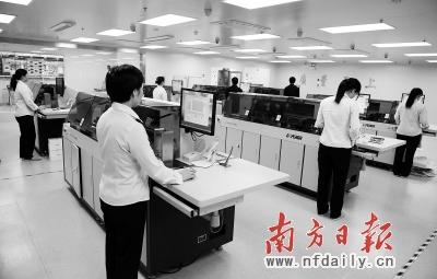 就在笔者参观制证车间时,眼前突然出现了一辆小车子,这是由省公安厅出入境管理局与企业联合研发设计的电磁导航运载车,运载车经过风淋室进入车间,沿着电磁轨道缓缓行进,沿途收纳已经办好的一摞摞的电子护照,广州、深圳、肇庆、茂名……每一摞电子护照根据申请人领取护照的所属地归类放好,并贴有说明字样的纸条。