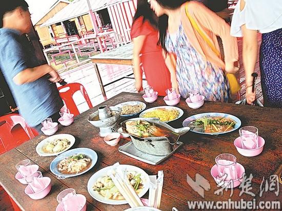 说是豪华自助餐,却一点也不豪华。餐厅地点设在一处高架桥下附近的一排平房里。餐厅布局与国内大排档差不多。记者所在的旅行团,进入餐厅时,发现里面人头攒动,已经有上百名游客在里面进餐。自助餐厅的餐台上,一字排开的有14道菜肴,卤鸡爪、卤骨排和炸鱼块等3道菜为荤菜外,其他多为包菜,菜芯,南瓜等常见素菜。
