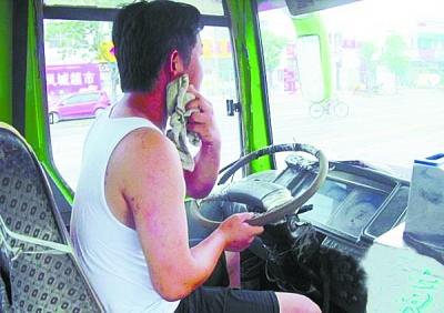 记者看到公交车司机也汗流浃背:“我们也没有办法,开一趟,就要换衣服。”