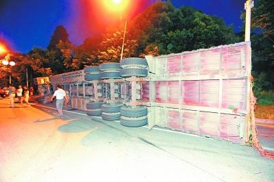 17米长的大货车侧翻路边。记者杨涛 实习生张仰强 摄
