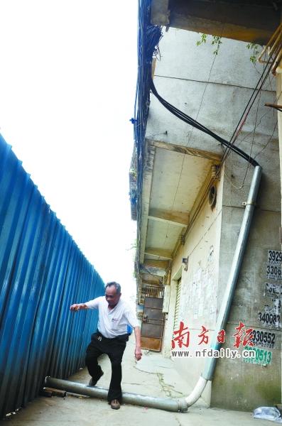 除了对居民的生活造成诸多不便外,铁皮围巷还潜在许多不安全因素,对当地居民的生活造成威胁。记者在现场看到,道路上不时有电线垂落下来,悬挂在行人头顶,十分危险。在该巷其中一处地方,电线甚至用一根直径约5厘米的水龙管包住,从地面上经过,一直延伸到工地处,路人或是开车者稍不注意,就容易被绊倒。