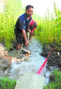 湖荆州市岑河镇近半数稻田出现旱情,当地相关部门及农户抽水抗旱。图为昨日上午,村干部带头抽水、清理沟渠。(记者 杨平 周志勇 摄)