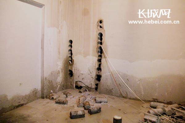 据介绍,7号楼地上26层,地下两层,近200户住户,负一层是公共区域,供住户停放自行车用。在介于1单元和2单元之间的位置,有两面墙体已被打穿了31个洞,有的地方齐根贯穿。地下散乱地堆着打穿的圆柱形墙芯,其间可见钢筋部分。