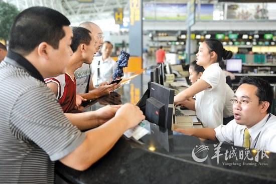 7月26日,广州白云机场,地服工作人员正在给乘客解释航班延误原因