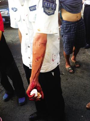 据伤者同事周先生介绍,受伤的城管队员杨宝玉伸手,准备将洋芋摊拉走时,女摊贩先拿起一个碗敲击杨宝玉的头部,随后又拎起炸洋芋用的不锈钢漏勺,猛砍杨宝玉的左手,杨随即血流不止。他们4人只是制止女摊贩打人,一直没有还手,事发后他们立即报警。随后将受伤的杨宝玉送医院治疗。
