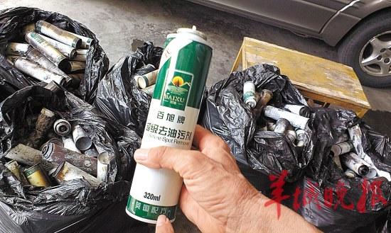 记者在小区保安宿舍附近看到9大袋“百旭牌超级去油污剂”化学喷雾,据保安介绍,这些全是他们从爆炸的房子里搬出来的,“就是这些易燃易爆品引发了爆炸”。这些化学喷雾产品说明显示为“广州市洁强商贸有限公司”生产,用于清除纺织品上的油渍斑点,瓶身没有标明具体成分,仅写着“英国配方”。据目测,现场堆有数百罐喷雾,每瓶容量为320毫升,没有完整包装,一按便有气雾喷出,大多数瓶子已被炸黑、变形,无法辨认产品是否已经使用过。