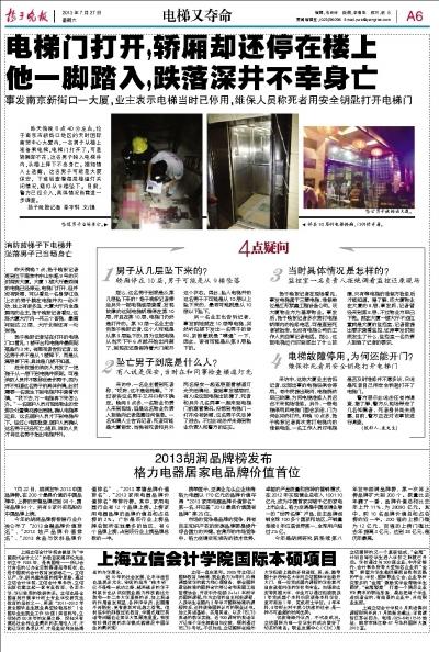 7月26日傍晚6:40左右,位于南京市新街口地区的天时国际商贸中心大厦内,一名男子从楼上准备乘电梯,电梯门打开了,可是轿厢却不在,这名男子跨入电梯井内,从楼上摔下不幸身亡。据知情人士透露,这名男子是大厦保安,下班后查看每层楼道灯关闭情况,从9楼坠下。