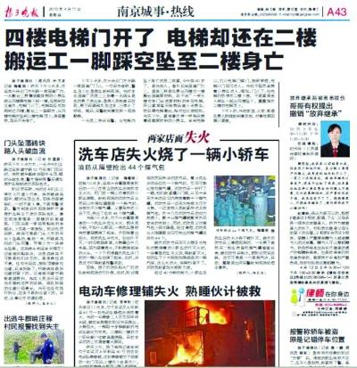 4月10日下午2点多,在南京六合北门方州路一家服装厂内,一名搬运工推着满载货物的小推车欲从四楼乘电梯下到一楼,电梯门开了,电梯却没有如期到达四楼,搬运工一脚踩空,从四楼电梯井坠到二楼电梯顶上,身受重伤,其后不治身亡。(记者 季宇轩 文/摄)