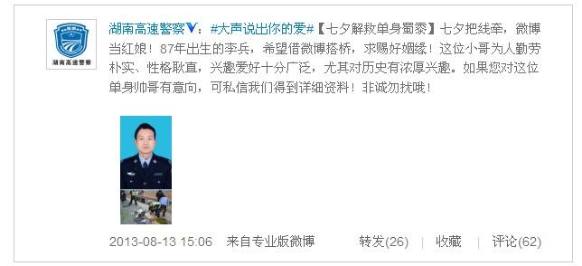 湖南高速交警支队微博工作室工作人员说,高速警察因为工作繁忙、时常加班等原因,很多青年交警仍是单身,“单身的高速交警大多数85后,如今也有很多90后加入高速交警队伍了。”发微博的目的“一是帮助他们求得好姻缘,二是通过这种形式,让更多人理解高速交警的工作”。