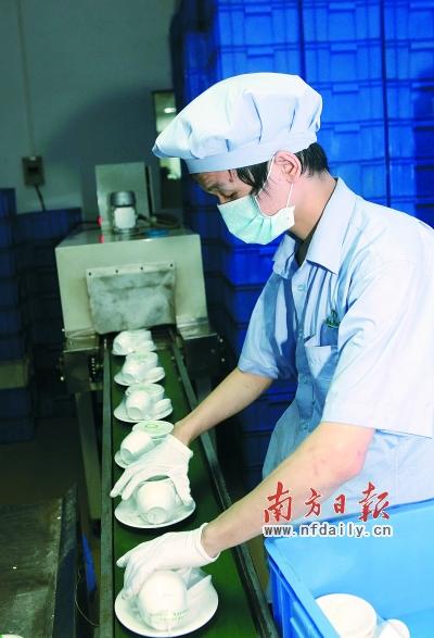工作人员将消毒机器设备上包装完毕的碗筷取出摆在箱子里。严华文 刘媚 摄