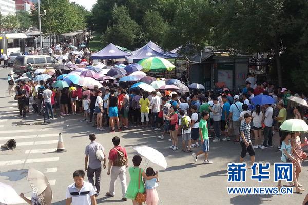 8日下午两点,北京大学东南门游客在烈日下排起长龙等候登记进入校园游览。张碧伦摄