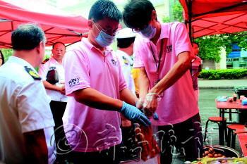 早餐抽检中,工作人员对油条进行采样。 记者 吕璐 摄