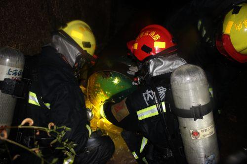 8月14日晚,消防官兵处理泄漏氯气罐。