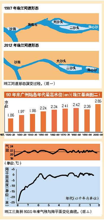 这些看似不相干的数据,联系在一起得出的结论却是让人害怕的。“你想象一下,这是很简单的道理:珠江底在升高、江面在变窄、土地在下沉,海平面在上升、雨量在增加,两岸不就淹没了吗?”李平日说,“现实就是这样。”