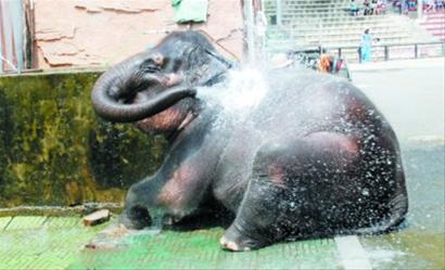 动物园熊猫搂冰块避暑 大象往身上喷水降温(图)