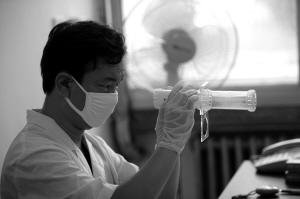 实验人员解释,幼虫实验就是加入一定浓度的药物,观察效果。针筒里做的是成蚊实验,先把蚊子放入有药物的一端,接触药物1个小时,再把蚊子转移到没有药物的一端封闭起来,每15分钟观察一次,计算每种药物的击倒时间,一般40多分钟能击倒80%。