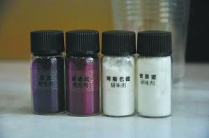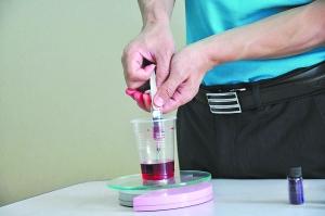 分别用针管抽取10ml纯净水加入两个塑料杯中,再加入甜味剂安赛蜜和阿斯巴甜各0.2克。在1号塑料杯中加入0.3克着色剂“诱惑红”,在2号塑料杯中加入0.3克着色剂“色蓝”,然后振荡均匀,分别制成红色和蓝色两种不同颜色的高浓度添加剂。