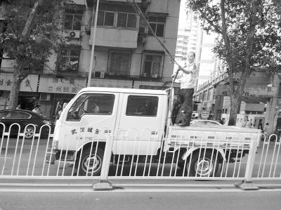 城管队员任智青站在车上托举电缆。(网友供图)