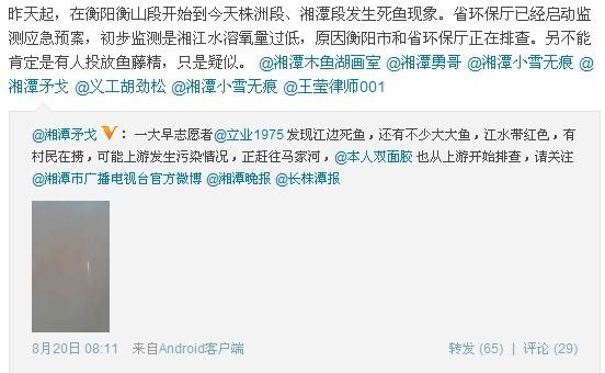 据媒体图片报道,19日起,在衡阳衡山段开始到20日株洲段、湘潭段发现大量死鱼,不少来此进行晨练或游泳的市民,纷纷加入了打捞的队伍。对此,记者从株洲市环保局官方微博看到官方回应称:湖南省环保厅已启动监测应急预案,初步监测是湘江水溶氧量过低,原因衡阳市和省环保厅正在排查。另不能肯定是有人投放鱼藤精,只是疑似。 (蒋琪)