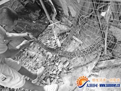 东坪山上的养鸡场陆续丢了22只鸡,这让看护养鸡场的林大爷很是心疼,他知道罪魁祸首是潜伏在养鸡场的大蟒蛇,但是由于蟒蛇“神出鬼没”,老是没有抓到。昨天13时许,这条蛇因为被卡在铁丝网上,终于“落网”了。