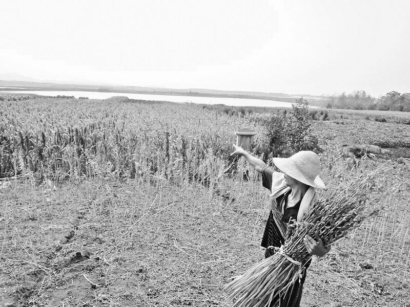 58岁的农民王海荣,站在秦咀水库旁的芝麻地里,望着远处水库里碧波荡漾的清水长叹:“看着水就是不能用,庄稼都旱死了!”