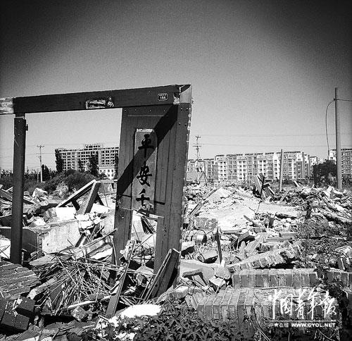 陈利利家被推倒的房子上,只剩下半个门框立着,对联也只剩下了半幅。本报记者 刘星摄