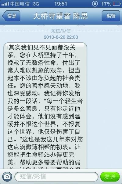 行将离开汕头时,陈思收到关微发过来的一条长长的短信。关微说:“其实我们见不见面都没关系,您在大桥坚持了十年,挽救了无数条性命,付出了常人难以想象的艰辛,担当起本不该由您负起的社会责任。您的善举感天动地,我也深受感动。”
