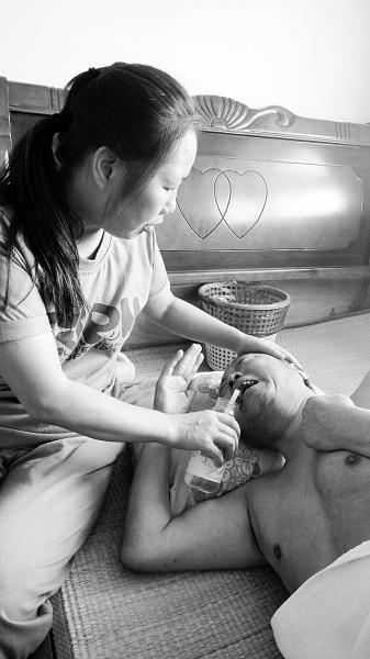 图为张汉先在给瘫痪在床的老公喂水。记者戴维 摄