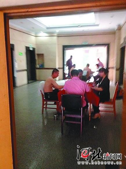 8月22日上午,新浪网友发微博称,石家庄经济学院教学一号楼大厅内,竟有将近十个人摆起了两桌麻将,在严肃的教学场所,“碰”“和”声不绝于耳,其中几个人因酷暑难耐,还脱光膀子,赤膊上阵。