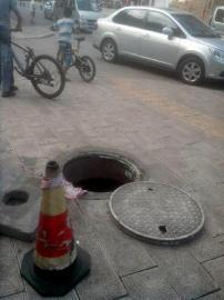 在市中区东站转盘某宾馆外人行道上,华西城市读本记者看到这“险些致命的窨井盖”。该井盖目前已被合上,上方压有一方形石块,旁边放置了一锥形筒。