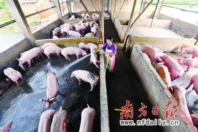 昨日下午,东莞中堂,欧槎养殖场,工人在给猪场内的猪冲洗。这是中堂最大规模的养殖场,即将面临清拆的命运。 苏仕日 欧迪鹏 摄