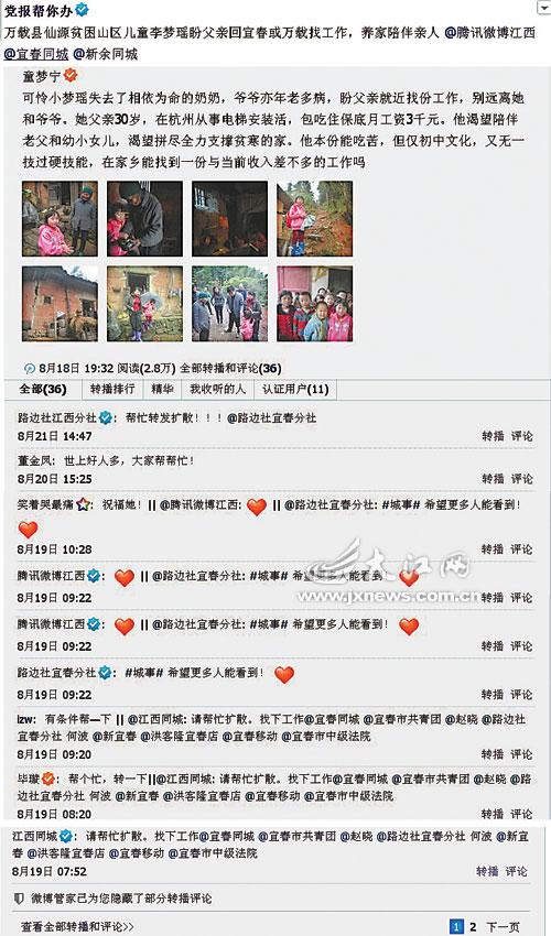 本栏目微博发布留守女童盼父回乡信息,众多网友为其父找工作