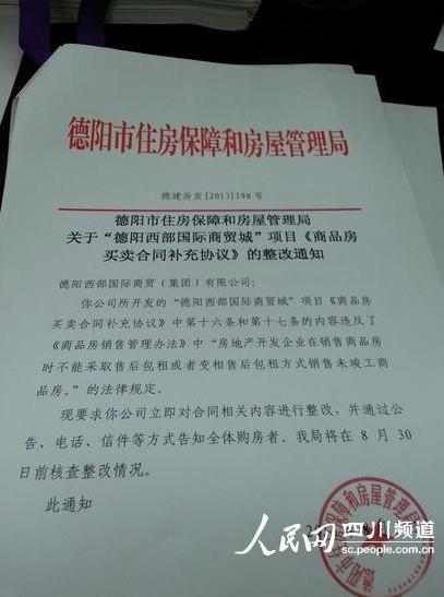 记者从德阳市住房保障和房屋管理局了解到,8月5日,德阳市房管局曾发布要求德阳西部国际商贸城就“商品房买卖合同补充协议”整改的通知。该通知写到:德阳西部国际商贸城”项目《商品房买卖合同补充协议》中第十六条和第十七条的内容违反了《商品房销售管理办法》中“房地产开发企业在销售商品房时不能采取售后包租或者变相售后包租方式销售未竣工商品房”的法律规定。